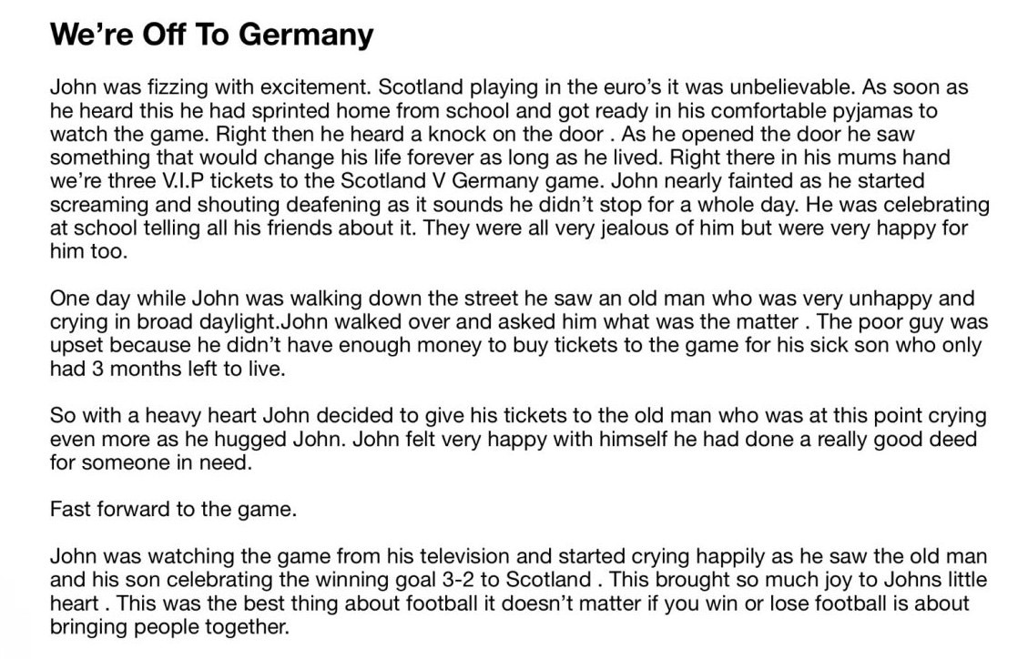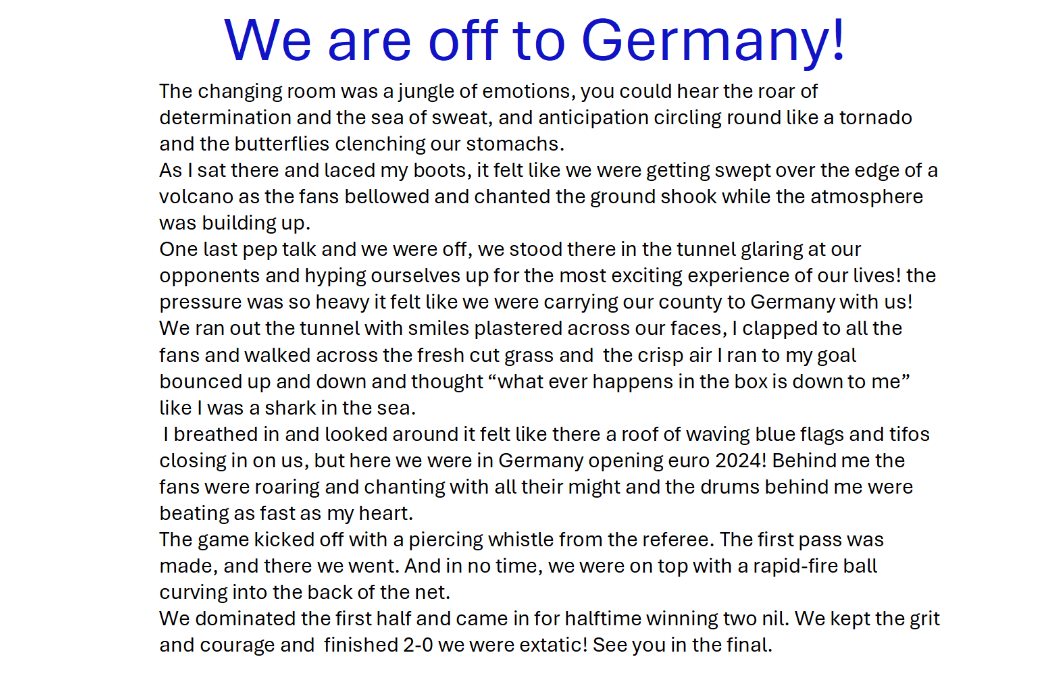 With Scotland preparing for EURO 2024 in Germany this summer, Learning Through Football invited pupils to ignite their imagination and create a short story titled; 'We're Off to Germany!'.